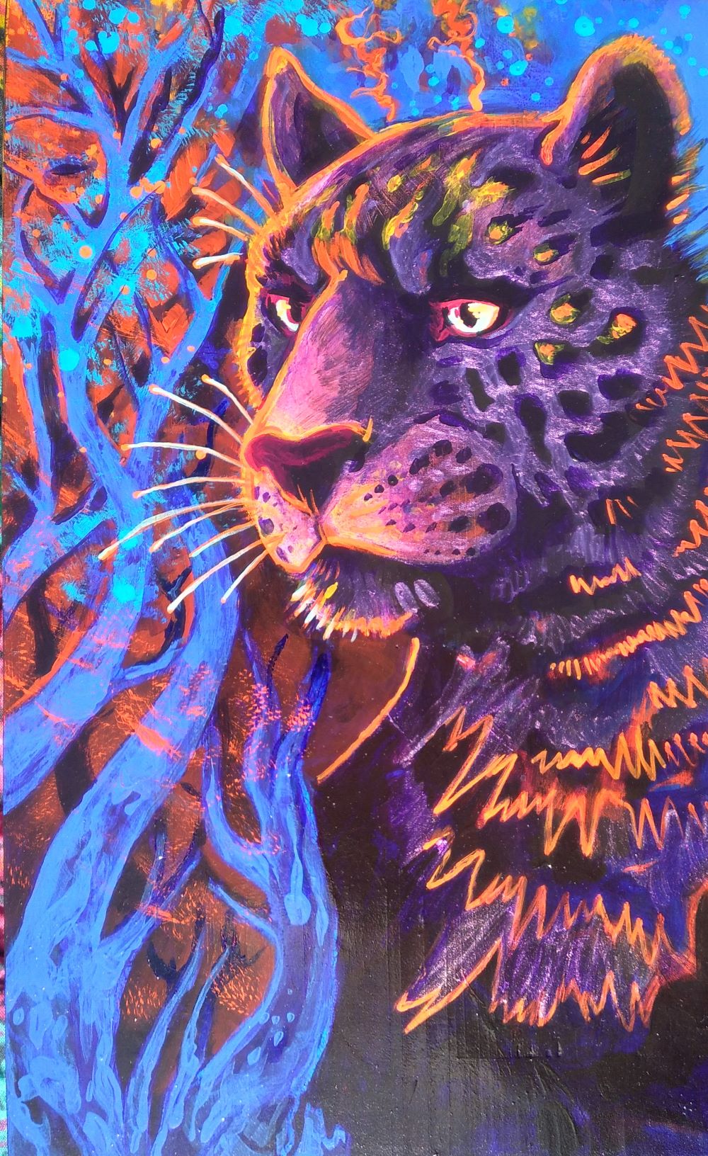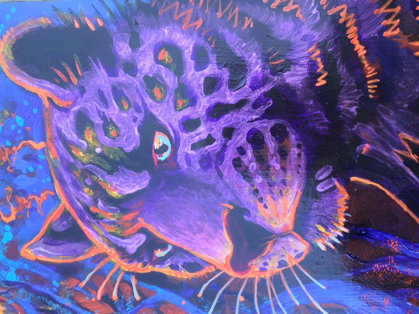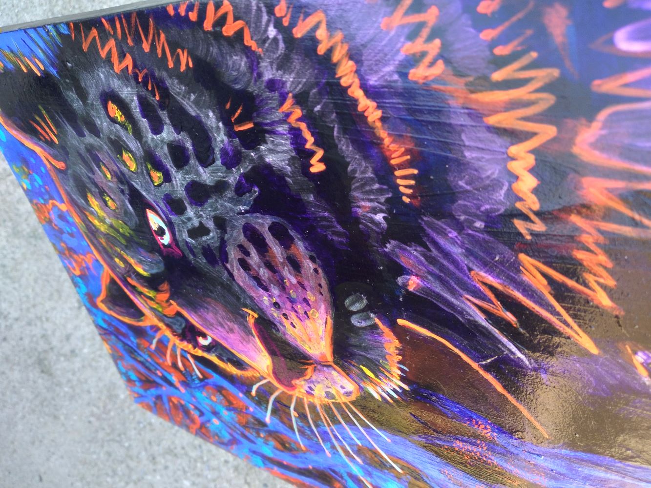 Acrylic paint wood - 9" x 15" ... incandescent paint shines green and violet in directional light.
