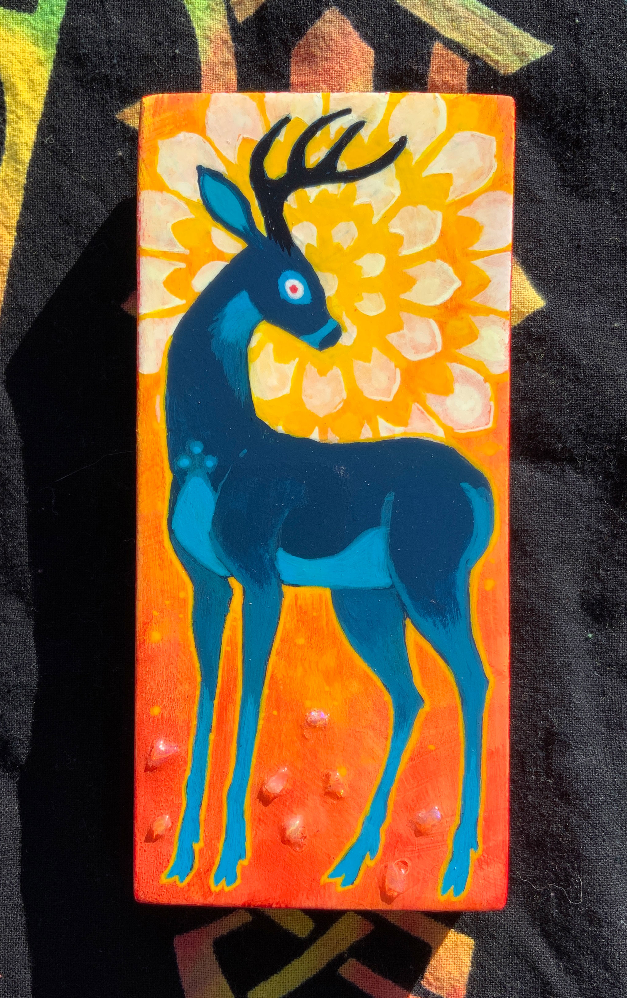 Acrylic paint on wood - 2.75" x 5.75" ... small pieces of Ethiopian opal at his feet.